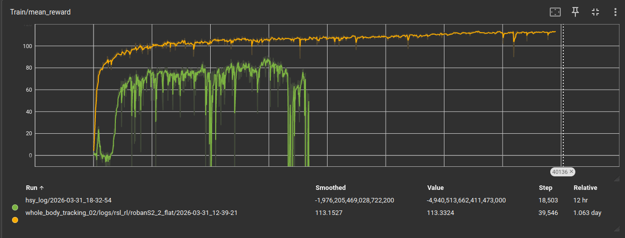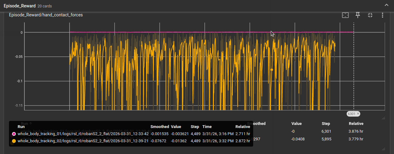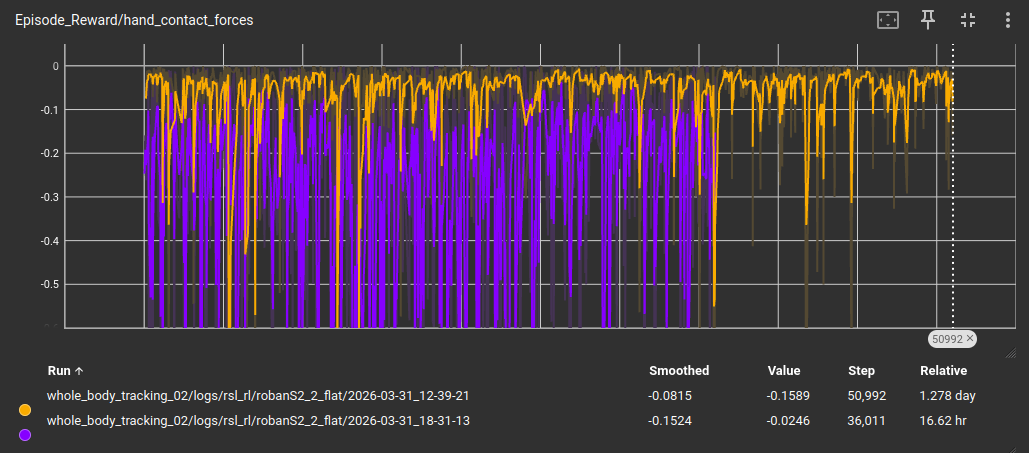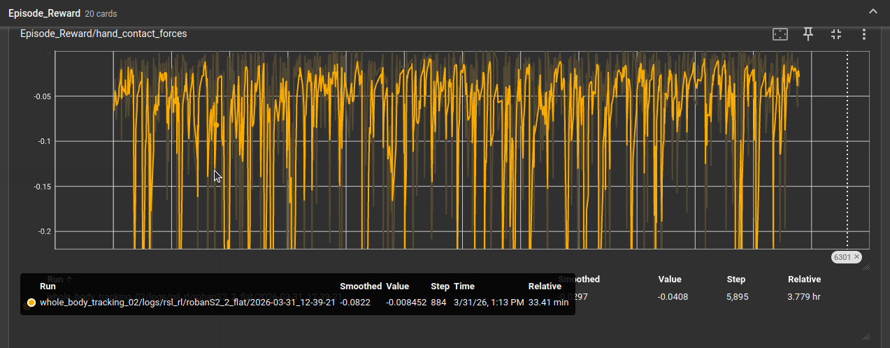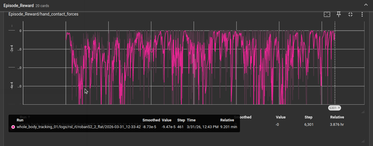 基于whole_body_tracking_02代码基础上,修改force_threshold从10.0减小为1.0时,训练曲线如下,对应图中绿色曲线,平均奖励值为负数,然后训练终止。