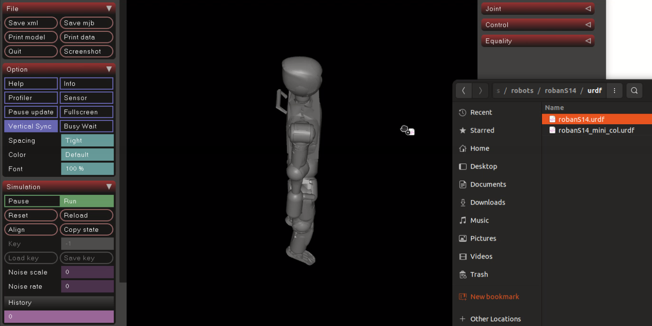 如下图所示,mujuco加载xml模型文件后,机器人精细模型为白色,碰撞体为红色部分。