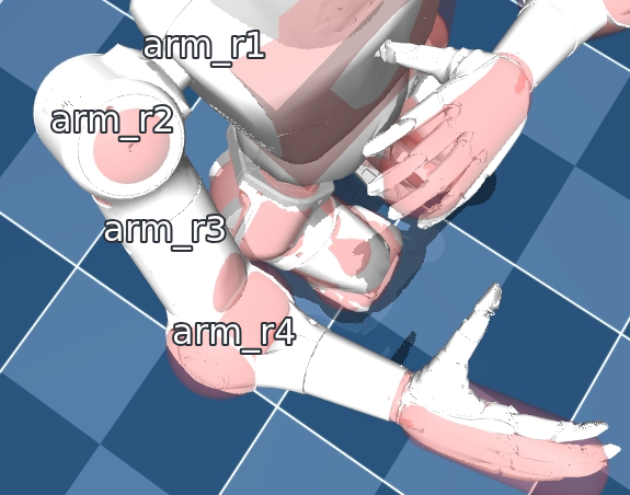 本案例中的问题是,机器人快速收回手臂至胸前的动作,手指会和身体发生碰撞。因此分析是手臂arm_2和arm_4电机转动角度过大,导致手部末端和身体碰撞。电机的关节顺序如下